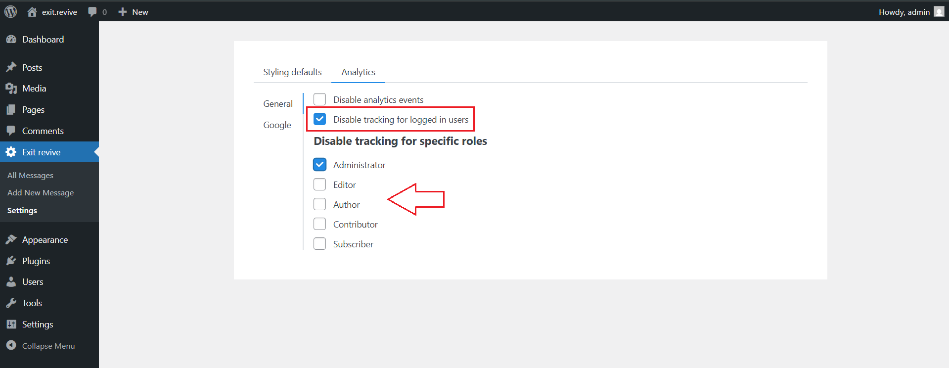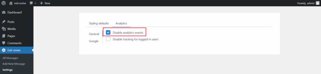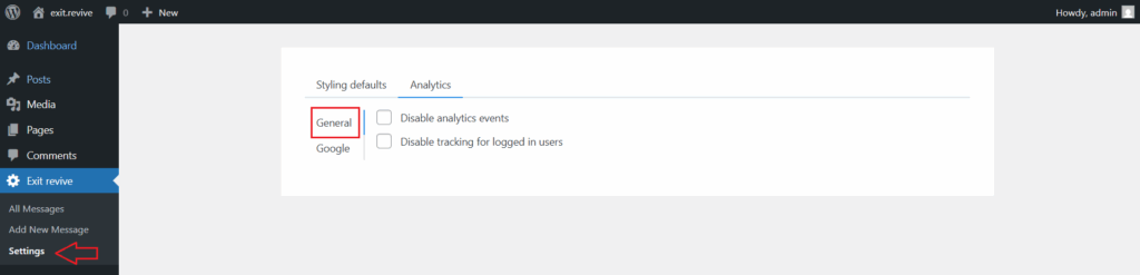 Head over to your WordPress dashboard > Exit Revive > Settings > Analytics > General
