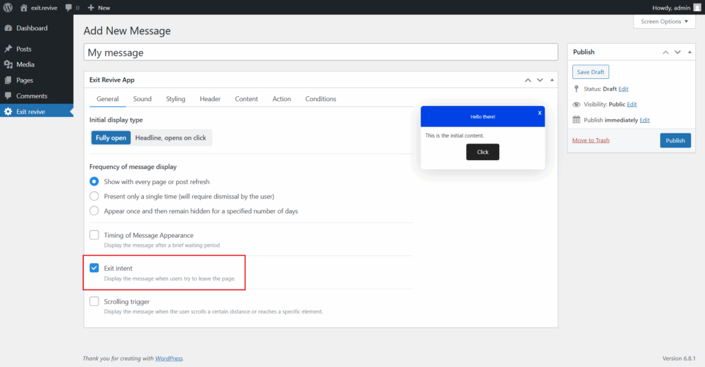 1. Head over to your WordPress dashboard > Exit Revive > Add new message