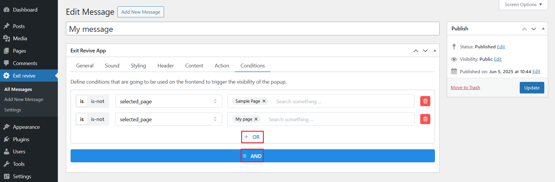 - AND means the popup will appear only if all the listed conditions are true.